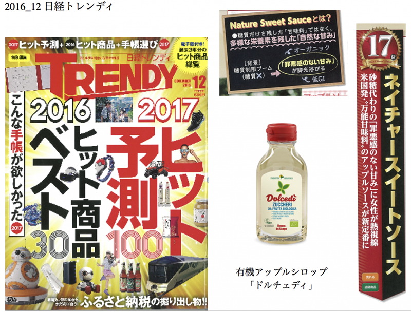 日経トレンディ 2017ヒットの予測で砂糖を代替する商品カテゴリー ネイチャースイートソースの中でリゴーニ ディ アシアゴ ドルチェディ(オーガニック アップルシロップ)が紹介されました。