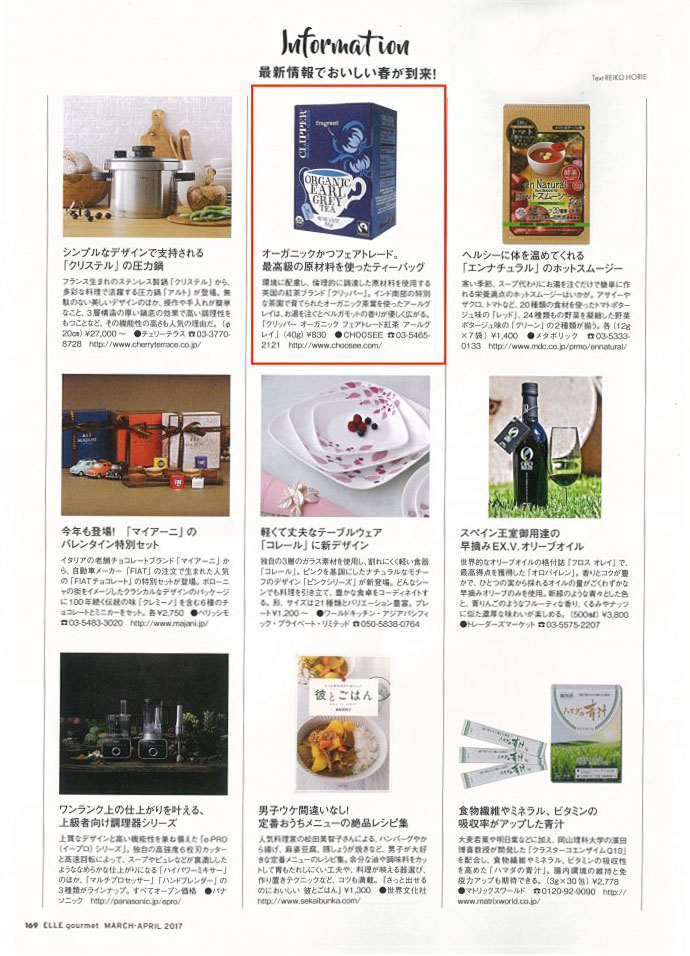 Elle gourmet2017, 3月号にCLIPPER Organic Fairtrade Earlgreyが紹介されました。